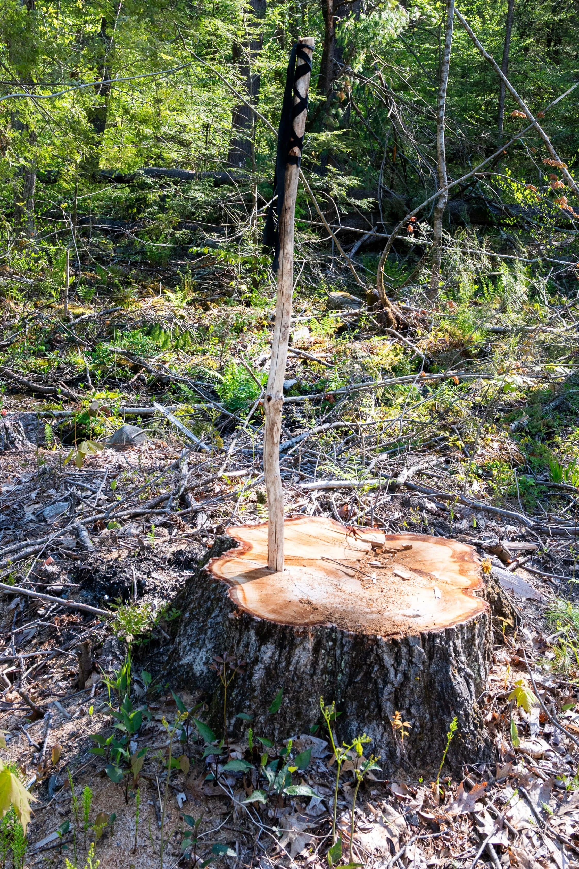 This Monday, a small group of residents planted sticks with natural fabric cloths next to the stumps in mourning for these trees in Northfield, Massachusetts and a few in Gill and Erving. There may be nothing we can do to stop the destruction (although we encourage all to try). But regardless, we need to mark our respect and despair at the loss of these trees. What follows is a photo essay of our installation of cloths (related to the Celtic/Scottish practice of tying cloths or clooties to tree branches) in respect for our lost neighbors, the trees. Please join us by making a symbolic gesture of some sort toward trees near you that have fallen to this mal-adapted wholesale killing of our friends, many of whom have lived here longer than two or three generations of our families.